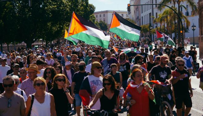 Ese es el lema de la marcha, que partía de la plaza de Asdrúbal para llegar hasta la plaza de San Juan de Dios, desplegando pancartas, banderas palestinas y consignas. De "las niñas de Gaza no son una amenaza", a "desde el río hasta el mar Palestina vencerá" o "Palestina aguanta, el mundo se levanta".