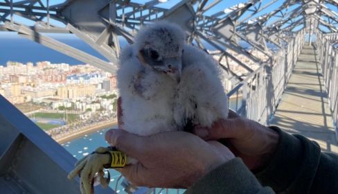Las visitas de control y anillamiento realizadas desde la delegación territorial de la Consejería han permitido constatar que la pareja de halcón peregrino instalada en Torre de Puntales de Cádiz se ha reproducido con éxito y se han llegado a contabilizar hasta 30 crías desde el año 2016.