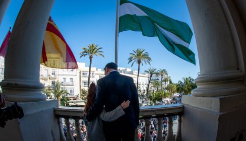 Entre los actos previstos por el Ayuntamiento, la plaza San Juan de Dios ha sido testigo del tradicional izado de la bandera verdiblanca a las 10.30 horas de este miércoles. Con el cielo despejado y la presencia de diferentes representantes políticos, la pregonera infantil del Carnaval, Sofía Letrán, ha sido la encargada de esta acción desde el balcón del Consistorio.