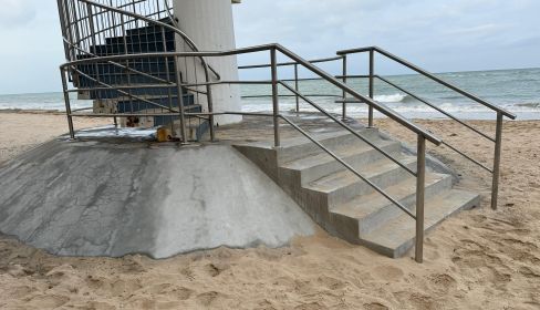 La reforma ha consistido en la elevación de la barandilla que comienza en el acceso desde el paseo marítimo y que continúa a lo largo de toda la bajada. También se ha instalado una barandilla en todo el perímetro de la base circular en la que descansa la estructura, reforzándola con hormigón en su conexión con la arena.