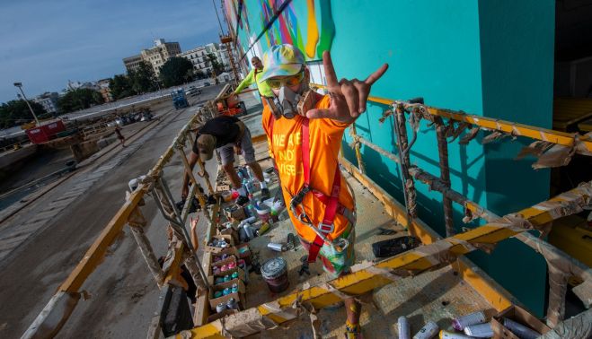 Recibe a las visitas en el andamio hidráulico, a 20 metros del cantil, y con un altavoz lanzando bachata a todo lo que da. "No puedo trabajar sin música", aclara. Incluso invita a los cámaras y redactores a bailar para resaltar que su labor es llenar de colores y vitalidad lugares atormentados por el gris y la prisa. Ahora le toca el turno al puerto de Cádiz.