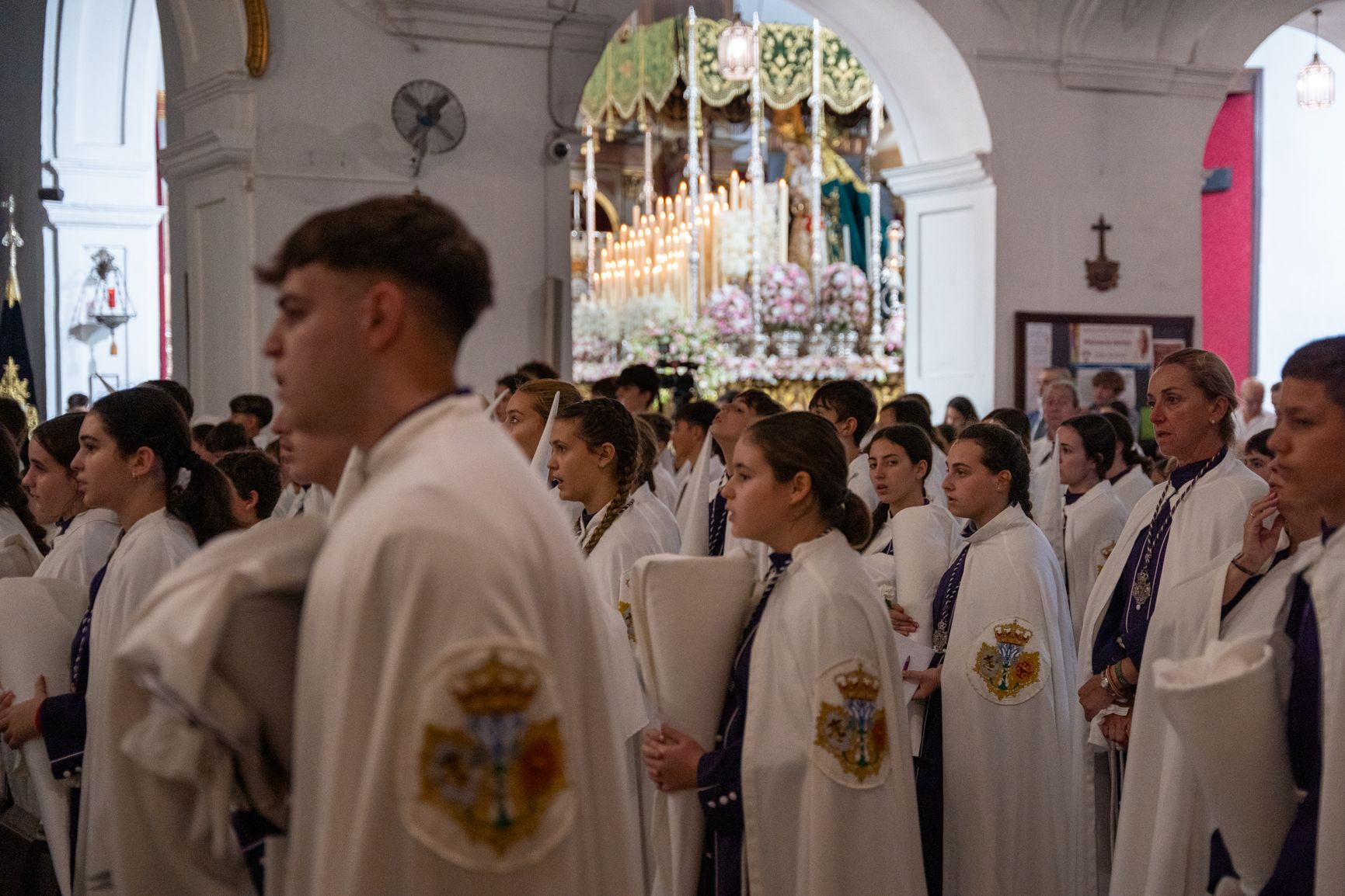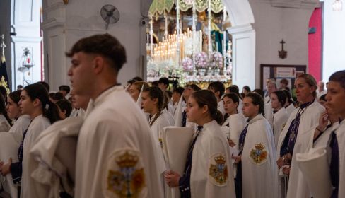 El templo queda abierto, los penitentes se mueven como hormigas blancas y azules, algunos se van, la mayoría se queda. Los hermanos mayores comienzan a proclamar la verdad resignada: "Las imágenes están aquí todo el año, sin falta, podemos rezarles todos los días".