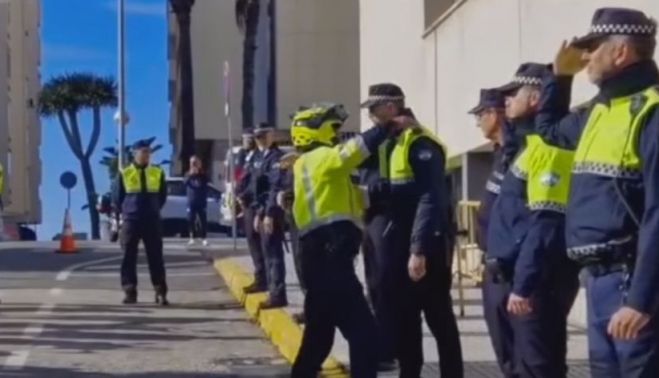 La Policía Local de Cádiz ha despedido con todos los honores a Javi, un compañero que después de casi 37 años de servicio encara su jubilación. Ha publicado un vídeo en sus redes sociales donde se ve el pasillo que le hicieron para reconocer su labor.