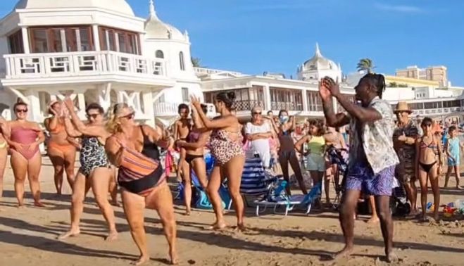En un vídeo, muestra cómo consiguió con un altavoz que la tarde en La Caleta tuviera otro brillo. Jóvenes y mayores, niños y abuelos, se unieron para aprender a bailar salsa en bañador, mientras Juan Diego daba ánimos para seguir dando cada uno de los pasos, y ayudando también a que todo el mundo se dejara llevar.