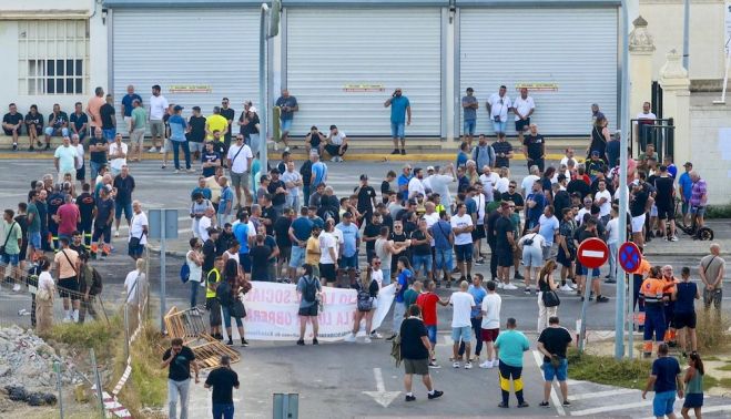 Las protestas comenzaron al amanecer en el acceso a Navantia Cádiz, con unos cien trabajadores que cortaron la carretera industrial como muestra de rechazo al acuerdo cerrado apenas siete horas antes por la patronal Femca y UGT en Jerez.