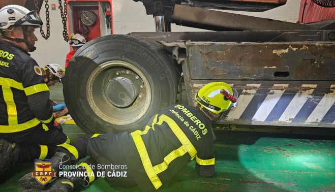 Bomberos del Consorcio Provincial del parque de Cádiz intervinieron en la noche de este viernes en el rescate de un hombre accidentado en la cubierta número 3 de un buque portacontenedores procedente de Canarias. El buque estaba atracado en el Puerto de Cádiz, en el muelle de Levante, en la terminal Acciona. El hombre quedó atrapado bajo las ruedas de una grúa de gran tonelaje que había sido arrastrada varios metros.