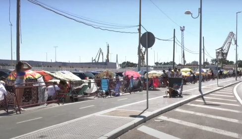 Sombrillas, sillas de playa, lonas para protegerse del sol... Todo tipo de elementos para hacer más llevadera la espera se dejan ver durante la jornada de este sábado en la larga cola establecida en las inmediaciones de la entrada al recinto donde Montes se subirá al escenario.