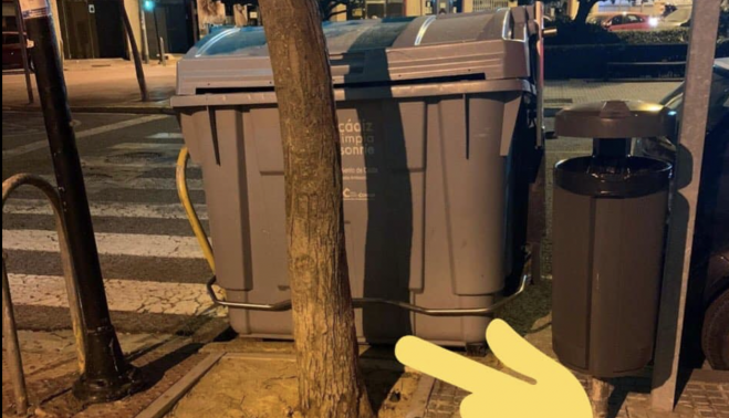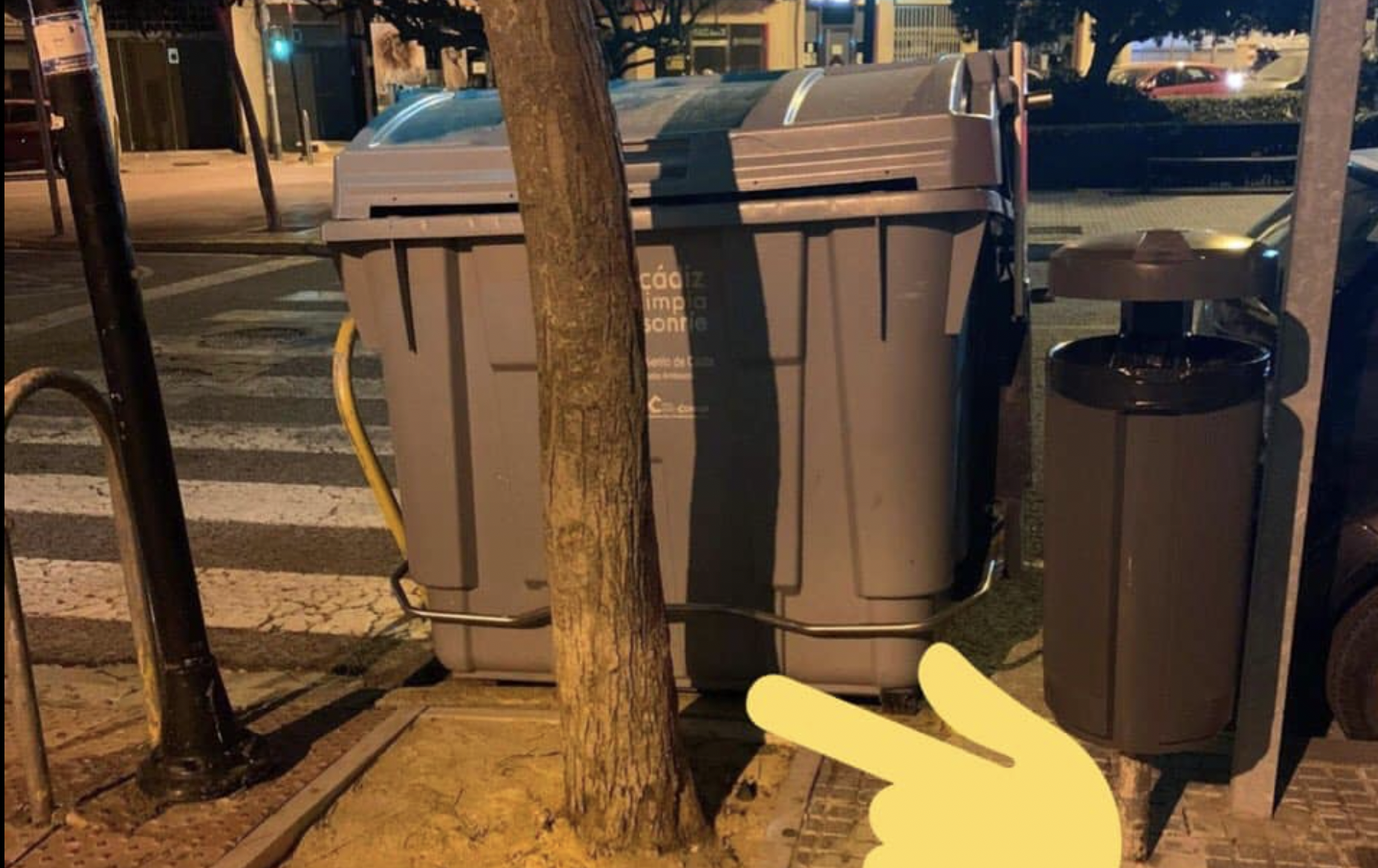 Cuando se dispone a tirarla, se da cuenta de que es imposible abrir el contenedor de residuos orgánicos porque está situado delante de un árbol. Esta escena cotidiana es, probablemente, la que viven los vecinos de esta zona de la capital gaditana cada vez que van a tirar la basura.