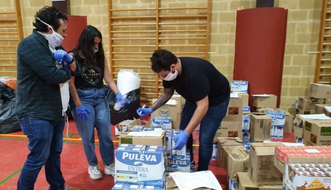 Un equipo de voluntariado ciudadano se encuentra en el pabellón deportivo de la barriada de La Paz de Cádiz organizando un cargamento de 7.500 kilos de comida aportados por el Banco de Alimentos. Este grupo de trabajo prepara lotes de alimentos que se destinarán a las familias vulnerables de la ciudad a través de la campaña de reparto de la delegación de Participación Ciudadana junto a las entidades ciudadanas.