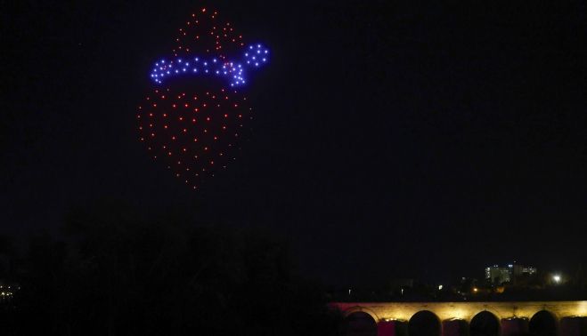El Puente Romano de Córdoba ha acogido este sábado, en dos pases a las 19.00 y 20.00 horas, el espectáculo de vuelo de drones Cuento de Navidad, una creación de la empresa madrileña Umiles Drone Light Show, incluida dentro de los actos navideños programados por la Delegación para el Centro Histórico del Ayuntamiento.