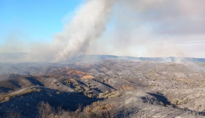 El incendio forestal avanza por las laderas desde el punto donde se encuentra el foco. Por un lado, hacia el este, fuera de la base militar, pero por otro, hacia el interior de esta, "donde no podemos trabajar".