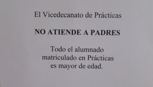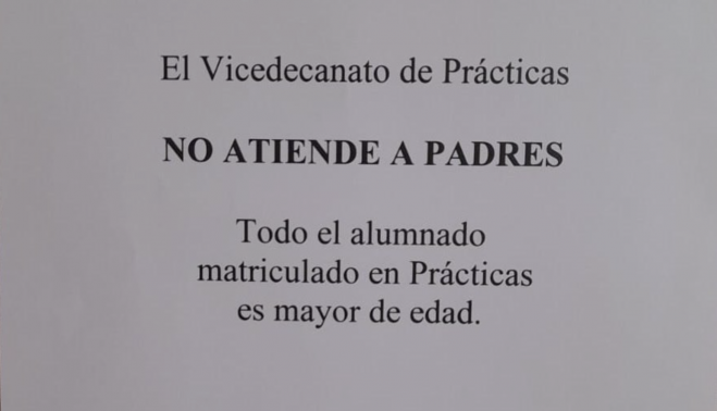 Un folio pegado en la puerta del Vicedecanato de Prácticas de la Facultad de Ciencias de la Educación de la Universidad de Granada ha encendido el debate en redes sociales. En letras grandes y claras, el cartel avisa de lo siguiente: “El Vicedecanato de Prácticas no atiende a padres. Todo el alumnado matriculado en Prácticas es mayor de edad”.