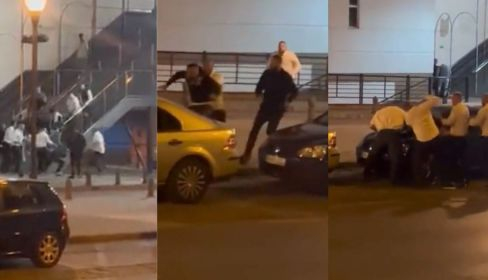 Tras un intercambio de golpes y empujones, varios de los responsables de seguridad del local se van hacia uno de los jóvenes, al que retienen contra un coche.