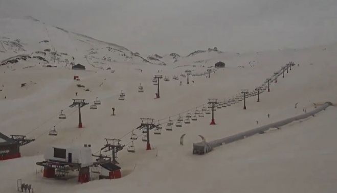 Este viernes no es un buen día para los amantes del esquí. La estación de Sierra Nevada, en Granada, permanecerá cerrada no solo por haber amanecido teñida de marrón, sino también por las fuertes rachas de viento que se están registrando en la zona.