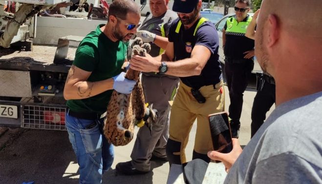 El línce, procedente de Toledo, se ha encontrado en la colonia de San Rafael. Según informa el consistorio, una veterinaria de la Consejería de Medio Ambiente, perteneciente al Plan de Atención al Lince Ibérico, ha sido la encargada de administrar un dardo tranquilizante, para hacer posible un rescate seguro y con todas las garantias de esta especie protegida.