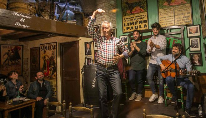 El local conserva objetos originales, carteles antiguos y hasta curiosas ilustraciones en las que Tintín y sus compañeros aparecen bebiendo en la barra, encargadas a artistas gaditanos. Pero si algo distingue a El Pasaje es el flamenco: tres espectáculos diarios gratuitos con cantaores, guitarristas y bailaoras a escasos metros del público.