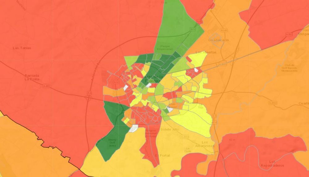 Así, la zona Sur se muestra en rojo porque muestra rentas de menos de 22.000 euros. El Chicle está en 13.285, frente a los 17.000 de las primeras viviendas de la avenida Blas Infante. No mucho mejor está La Granja, con rentas también inferiores a esa cifra para familias completas en 2018. En 18.000 euros está la zona de la plaza de Algar o plaza de Zahara, las que menos renta familiar tienen. La Constancia, prácticamente centro de Jerez, hay una zona con renta por debajo de los 19.000 rodeada de rentas más altas, tanto hacia la plaza del Caballo como hacia la barriada España, ésta con rentas de casi 27.000 euros.