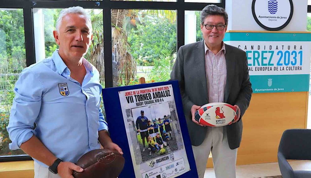 El delegado de Deportes y Educación, José Ángel Aparicio, junto al presidente del Club de Rugby Unión Xerez, Pablo Vallejo, ha presentado el VII Torneo de Andalucía Rugby Gradual M10-8-6 que este próximo sábado, 10 de mayo, de 10 a 17 horas, se disputará en la pradera Laura Delgado Bimba del complejo deportivo municipal de Chapín.