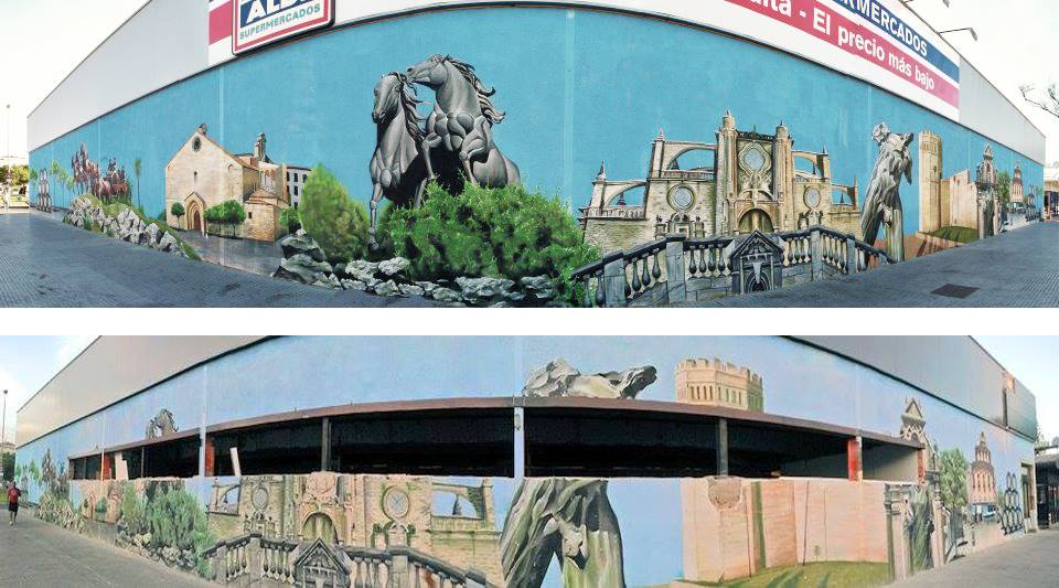 Cuatro años después de ser realizado, obras de ampliación del supermercado donde se ubica, en la avenida Alcalde Jesús Mantaras, acaban con parte de la pintura donde se reflejan los principales monumentos de la ciudad.
