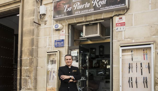 Galisteo tenía apenas 15 años cuando entró por la puerta de la relojería La Puerta Real, que entonces regentaba su tío, Francisco Núñez Romero, que abrió el negocio en 1972. Medio siglo contempla al pequeño establecimiento, situado en plena muralla de Jerez, que en pocos días cambiará de ubicación.