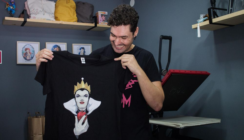 Este emprendedor local tiene claro que "hay muchas tiendas de este estilo pero yo intento destacar a través de los diseños personalizados. Lo que una persona vaya a recibir de mi parte va a ser único, no lo va a llevar nadie más". Así, intenta darle un giro a todo lo que le piden. Por ejemplo, en su página web tiene una galería de imágenes titulada 'Princesas guerreras', en las que representa a las princesas Disney saliéndose del papel habitual que se les da en estas producciones. ¿Por qué tienen que ser tan ñoñas? Yo quiero que sean independientes y fuertes, por eso he dibujado a la Bella Durmiente con un abrigo que se ha hecho con Bestia", comenta. Para realizar la impresión utiliza el sistema DTG o de impresión directa en prenda, mediante el cual añaden la imagen a través de una pegatina. Además, las camisetas que usa son de alta calidad, hechas 100% de algodón.
