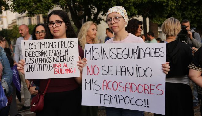 Este martes se ha celebrado una concentración en la plaza del Arenal de Jerez, convocada por la Flampa (Federación local de asociaciones de madres y padres del alumnado), a la que ha acudido en persona. Para ponerse en primera fila. Para sostener una pancarta —"mis inseguridades no se han ido, mis acosadores tampoco"—, y para gritar bien alto que no acude por ella, "sino por aquellas personas que ya no están aquí y no pueden, por quienes no tuvieron la ocasión de haberlo dicho; y también por quien no se atreve a decirlo".