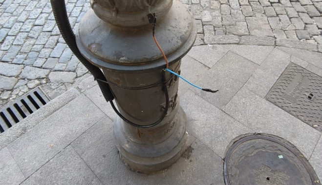El portavoz del PSOE local, José Antonio Díaz, también ha mostrado imágenes del cable, que está por fuera con dos cintas aislantes como único elemento para tapar el riesgo, y la farola en cuestión.