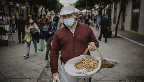 La fórmula es sencilla: conitos de papel de estraza gris que Jesús rellena con las almendras fritas por su mujer, María Dolores. Una cesta de mimbre repleta de almendras y con bien de sal gorda por encima hacen que familias enteras se paren continuamente para comprar un paquete por dos euros o la ofertita de dos por tres euros.
