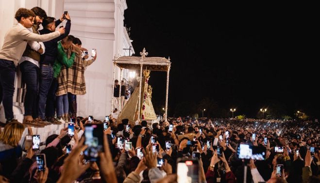 Solo cinco minutos después del salto de la reja, la Virgen era recibida por miles de personas que la esperaban fuera del santuario y que aguardaban en la explanada de la entrada de la ermita desde la media noche, cuando daba comienzo el Rosario de las Hermandades.