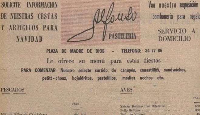 Aparte de los precios, muy llamativos por figurar lógicamente por la época en pesetas, llama mucho la atención algunos de los platos preparados que se ofrecen en la que fuera emblemática pastelería y bombonería de Madre de Dios.