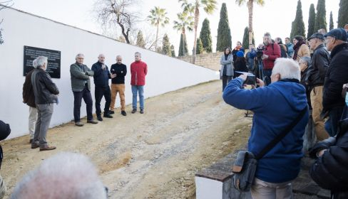 El delegado de Cultura, Francisco Camas, acompañado del delegado de Reactivación Económica, Captación de Inversiones, Educación y Empleo, Juan Antonio Cabello, ha asistido a la inauguración de una placa en el recinto del antiguo Teatro Eslava de Jerez, en el entorno del Conjunto Monumental del Alcázar, en memoria de las personas represaliadas y asesinadas por el franquismo.