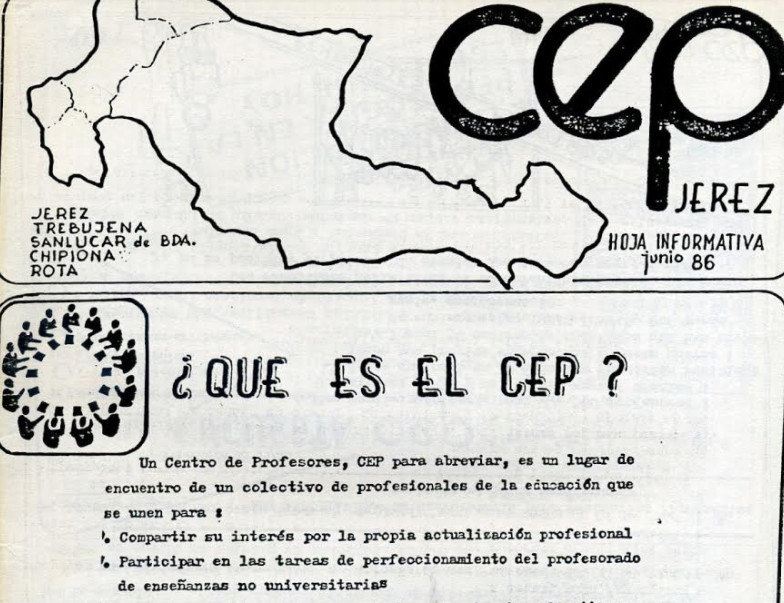 "La escuela —rememora García-Lázaro, primer coordinador del centro jerezano y que ahora da clases en el IES Fernando Savater— era muy tradicional en España, pero en Jerez tuvimos un paréntesis muy afortunado que sirvió de precedente; desde que murió Franco, tuvimos la figura de un inspector de Educación, encarnado en Francisco Fernández Pozar, que nos hizo crecer sobre un terreno abonado porque dinamizó mucho; puso, como se diría ahora, a trabajar a los centros en red y nos beneficiamos de ese trabajo en equipo y de un hombre que provocó mucha transformación". Junio de 1986: ¿Qué es el CEP?, preguntaba la hoja informativa que publicaba el grupo comandado por otros docentes como Javier Fernández Azuar y Pepe García Oliva. El CEP, "para abreviar, es un lugar de encuentro de un colectivo de profesionales de la educación que se unen para compartir su interés por la propia actualización profesional; participar en las tareas de perfeccionamiento del profesorado de enseñanzas no universitarias; y promocionar, dinamizar y seguir las experiencias educativas y didácticas que se realicen en el marco de la renovación pedagógica y en una búsqueda continua de mejora de la acción docente (...)". El CEP era todo eso y cientos de cosas más.