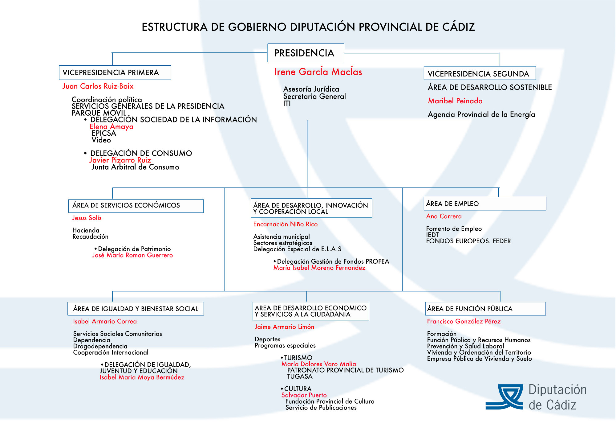 En Diputación, además de las funciones relativas a la secretaría general y la asesoría jurídica, Irene García también asumirá las gestiones derivadas de la Iniciativa Territorial Integrada que competen al ente provincial. La estructura del ejecutivo provincial consta de dos vicepresidencias: la primera, con Juan Carlos Ruiz-Boix al frente, emprenderá la Coordinación Política y los Servicios Generales de la Presidencia; y la segunda, enunciada como área de Desarrollo Sostenible, está encabezada por Maribel Peinado (PA) y conlleva la dirección del organismo Agencia Provincial de la Energía.