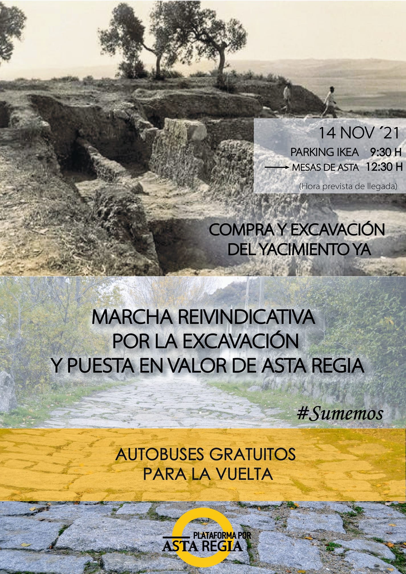 La Plataforma ciudadana Asta Regia, creada para la conservación y la defensa del yacimiento de Asta Regia y la dignificación de este conjunto monumental, prepara para este domingo día 14 de noviembre una movilización a pie que irá desde la explanada del parking de Ikea al municipio gaditano de las Mesas de Asta, donde se encuentra el yacimiento. El recorrido, que se llevará a cabo por la carretera autonómica A-2000 que une Trebujena con Jerez de la Frontera, comenzará a las 9.30 horas y tiene previsto finalizar pasadas las doce y media del mediodía, con autobuses gratuitos para la vuelta.