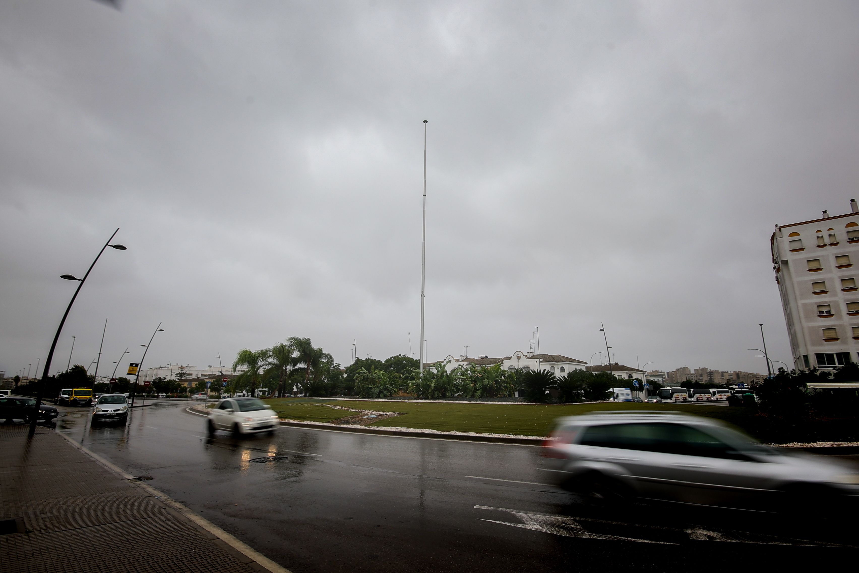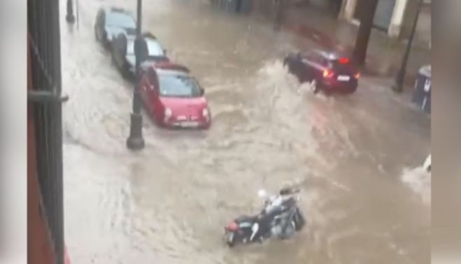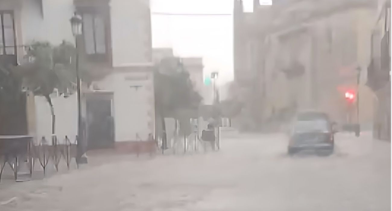 La calle Ancha de Jerez se ha convertido en un auténtico río de agua tras el paso de la borrasca Aline por la ciudad.