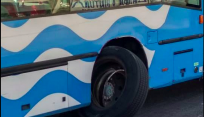 Enésima avería de un autobús urbano de la vieja flota madrileña que el gobierno de García-Pelayo trajo para Jerez, esta vez con la novedad de que la misma se ha centrado en una rueda, cuyo neumático prácticamente ha perdido al tomar la rotonda de Biarritz, entre la barriada de Olivar de Rivero y la avenida Lola Flores.