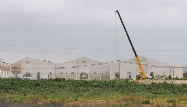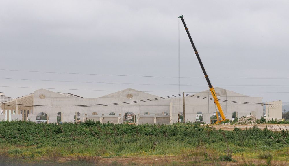 La imagen actual del enclave refleja ya un avance significativo. En ella se aprecia una gran estructura de hormigón en fase de construcción, con amplias arcadas que perfilan el diseño arquitectónico orientado tanto a la funcionalidad industrial como al uso turístico. Una grúa de gran tamaño está trabajando sobre el terreno, poniendo de manifiesto que las labores se encuentran en una fase activa de edificación estructural.
