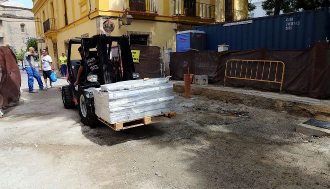 El Ayuntamiento de Jerez ha reanudado este lunes los trabajos de instalación del nuevo pavimento en el tramo comprendido entre la plaza de San Juan y Santiago, incluidos dentro del proyecto de reordenación del eje viario Puerta Sevilla-Puerta Santiago.