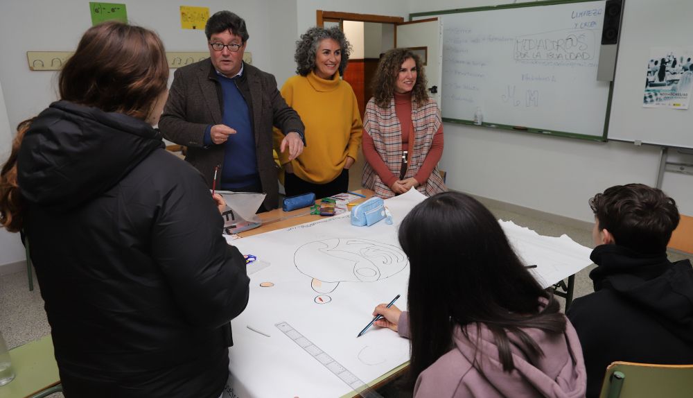 La Delegación de Igualdad y Diversidad tiene en marcha el Programa Mediadores por la Igualdad en diez institutos de la ciudad. Con este programa, el alumnado participante, en torno a 133 estudiantes, se forma para colaborar en la detección y prevención de situaciones de discriminación, violencia machista o LGTBIfobia en sus centros. La teniente de alcaldesa Susana Sánchez, y el delegado de Educación, José Ángel Aparicio, han visitado al alumnado participante en estas actividades en el IES Josefa de los Reyes, donde han sido recibidos por su director, Álvaro Moreno Santana.