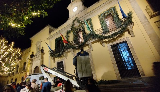 Esta noche de jueves, en mitad del puente de la Constitución y la Inmaculada, se ha instalado la decoración navideña de la fachada del Ayuntamiento de Jerez.