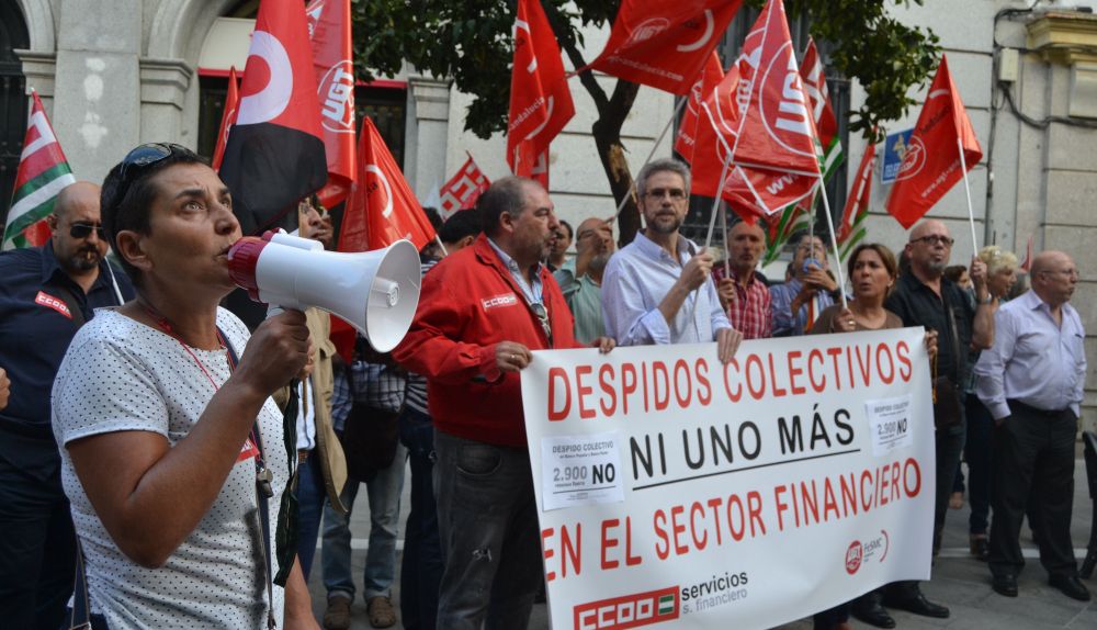 Trabajadores de la entidad bancaria se concentran a las puertas de la oficina principal en calle Larga para protestar por el ERE que afectará a 2.900 empleados a en toda España.