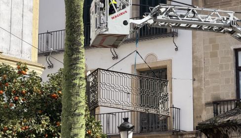 Bomberos del Consorcio de la Provincia de Cádiz han acudido a la plaza Rivero del centro de Jerez en el mediodía de este sábado para retirar la barandilla de forja de un balcón.