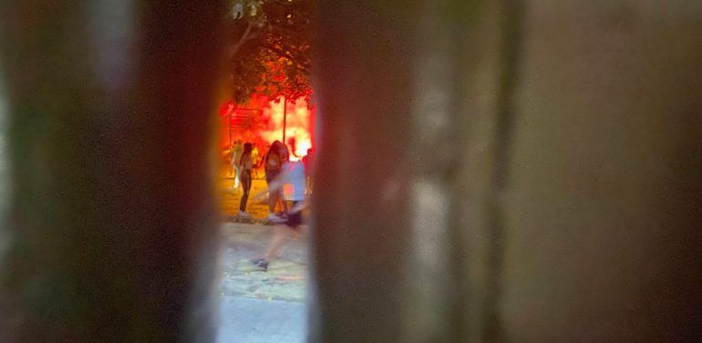 A partir del descanso y de la segunda parte, la sede del Club, justo al lado del estadio, empieza a ser un hervidero. Desde mesas a sillas que vuelan, incidentes con los vehículos, contenedores volcados e incluso un atropello a un aficionado por un furgón. Fue entonces cuando se desencadenó una batalla campal, con cargas policiales y disparos con bolas de goma.