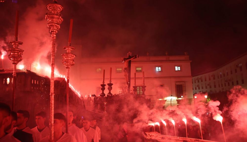 Finalmente, la previsión se cumplió y un aguacero intenso descargó sobre la ciudad, aunque no impidió que la cofradía cumpliera con uno de los momentos más emblemáticos de su estación: la recogida entre bengalas en la subida a la Catedral.