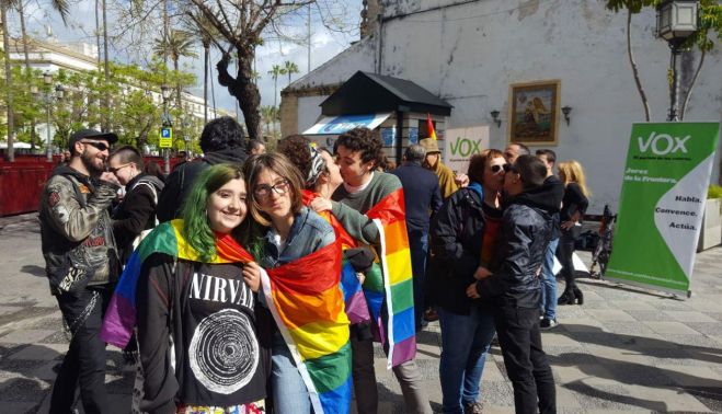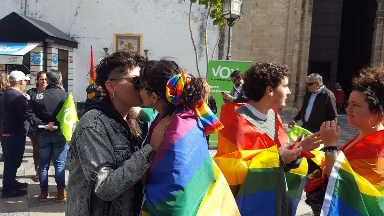"Antes de que nos coman, nos comemos la boca", así se anunciaba la convocatoria impulsada a través de las redes sociales por la militancia LGTBI de Jerez, que pedía a los manifestantes un extra: "Trae tus banderas, camisetas, pinturas LGTBI y todo tu amor".