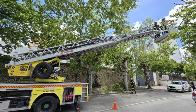 Tras recibir el aviso, los bomberos se han desplazado rápidamente al lugar con dos camiones, acompañados por patrullas de la Policía Local que han regulado el tráfico durante la intervención. La rama, que presentaba una fractura casi total, ha sido finalmente cortada para evitar posibles riesgos.