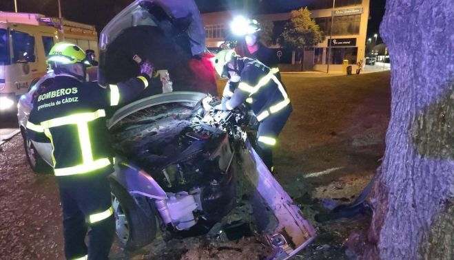 Un herido a primera hora de este lunes en Jerez tras un brutal impacto frontal del coche que conducía contra un árbol, en la glorieta de La Vid con la avenida de la Universidad.