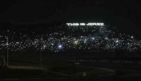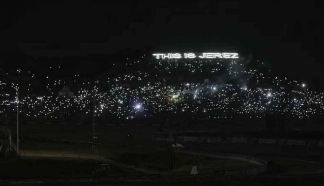 Y la catedral del motociclismo no podía amanecer de otra forma tan espectacular como lo ha hecho el Circuito de Jerez, donde poco a poco, como si de un concierto se tratase, han ido encendiéndose las luces de los móviles, de aquellos que se han dado un madrugón de aúpa, para ganarle la partida a la oscuridad en la zona del monte, conocida popularmente como la pelouse, donde también se iluminaban las letras con el mensaje This is Jerez.