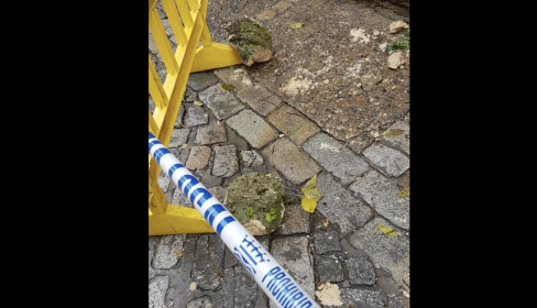 Afortunadamente, una vez más no ha habido que lamentar daños personales, aunque la gárgola, una pieza valiosa, ha quedado hecha pedazos en el suelo. Pedazos que, con nula sensibilidad y aprecio por el patrimonio, no se han puesto a buen recaudo sino que han servido, sin ir más lejos, para sujeta la valla con la que la Policía Local ha cercado la zona donde se ha producido el derrumbe.