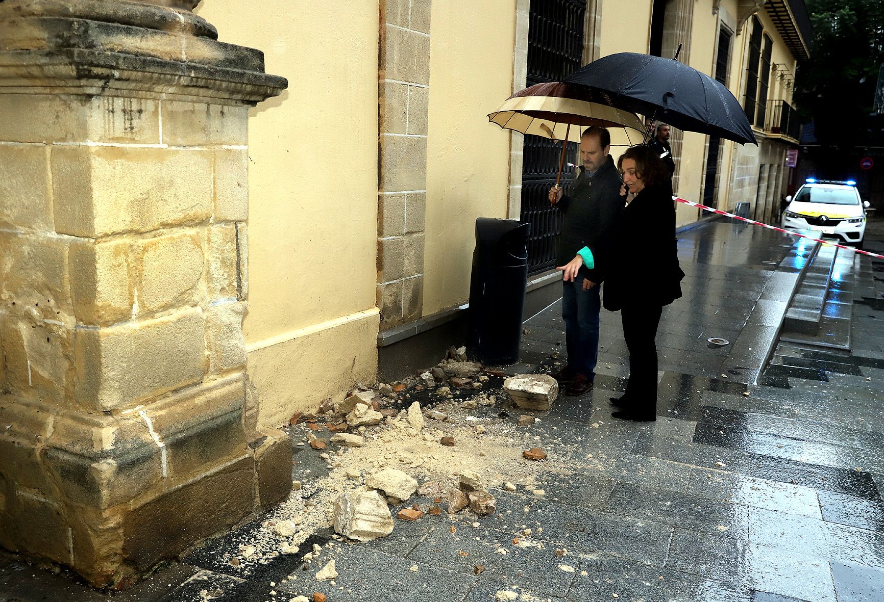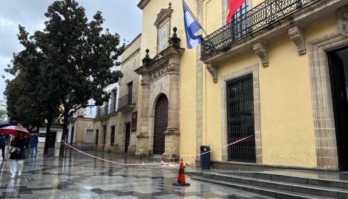 Las intensas lluvias de esta noche han provocado la caída de una parte de la cornisa del Ayuntamiento de Jerez.